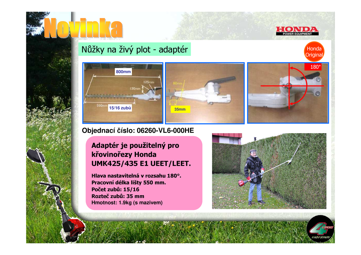 Nástavec s nůžkami na živý plot pro křovinořez Honda 425/435 s obloukovou rukojetí (typ L) s oboustranou lištou o délce lišty 55 cm. Je určen hlavně pro zarovnávání a zastřihování živých plotů vyšších výšek kam nezle dosáhnout jednoúčelovými nůžkami na živý plot.